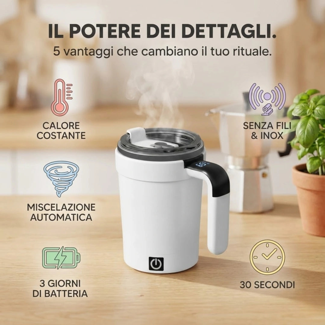 Dimentica il caffè tiepido e i fondi slegati. Absolu Mug™ trasforma la fretta in un momento di puro piacere. Grazie alla fusione tra calore costante e miscelazione StirTech™, ogni sorso resta caldo, cremoso e perfettamente bilanciato. È il rispetto che il tuo caffè merita.