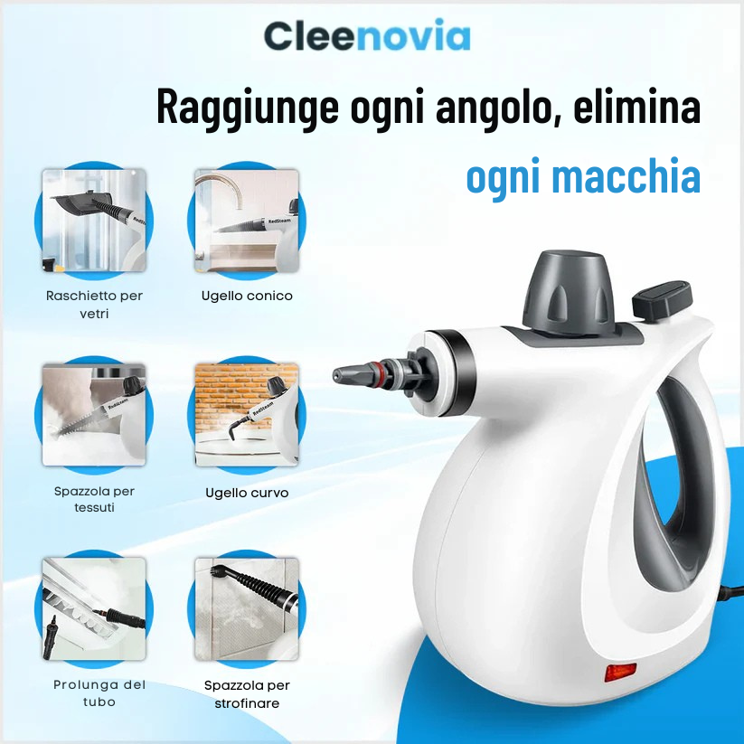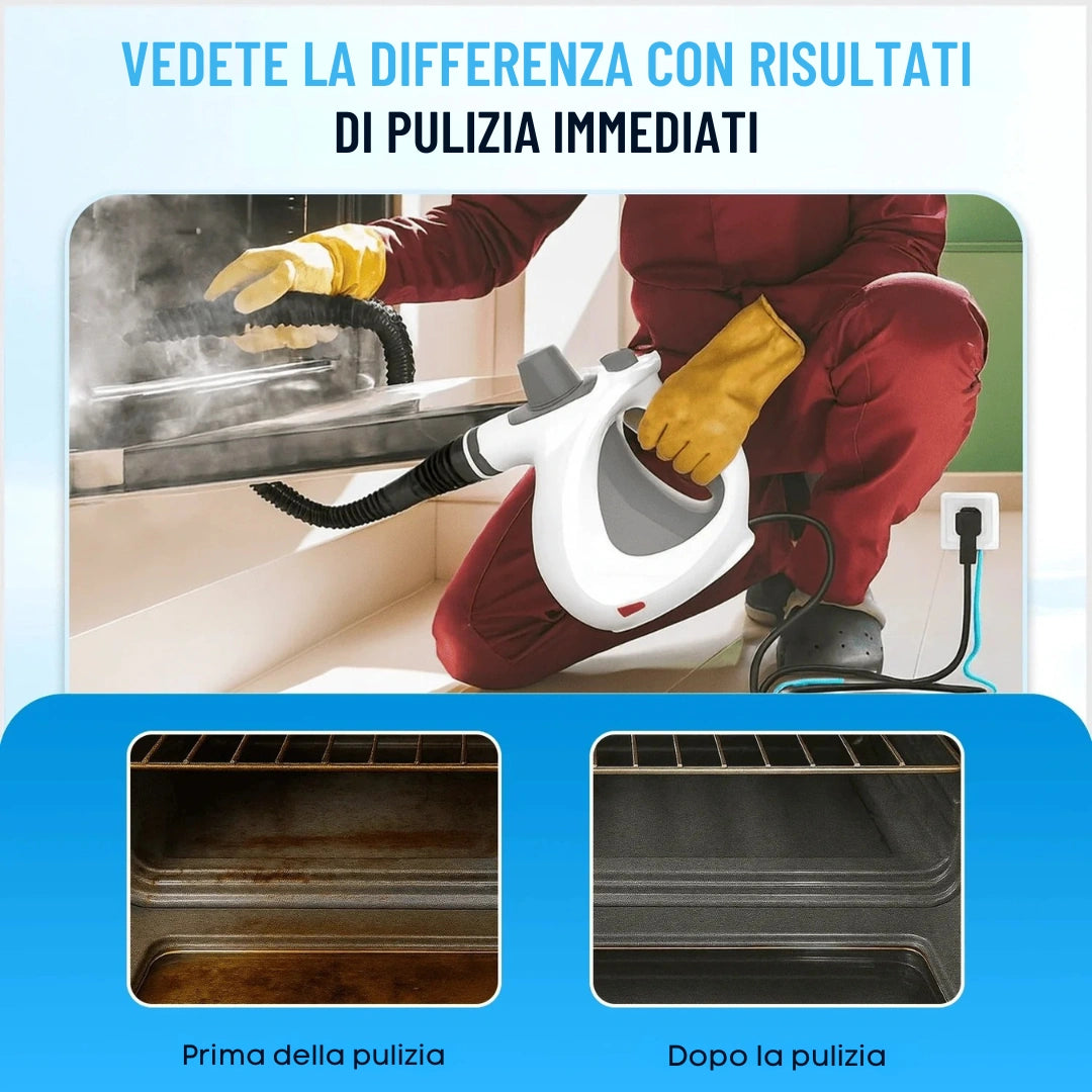 Questo potente pulitore a vapore utilizza vapore secco surriscaldato a oltre 100 °C, molto più efficace dei normali detergenti tradizionali.