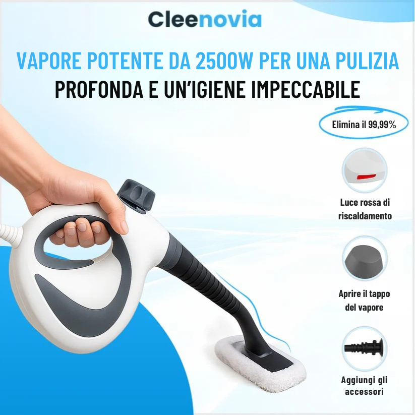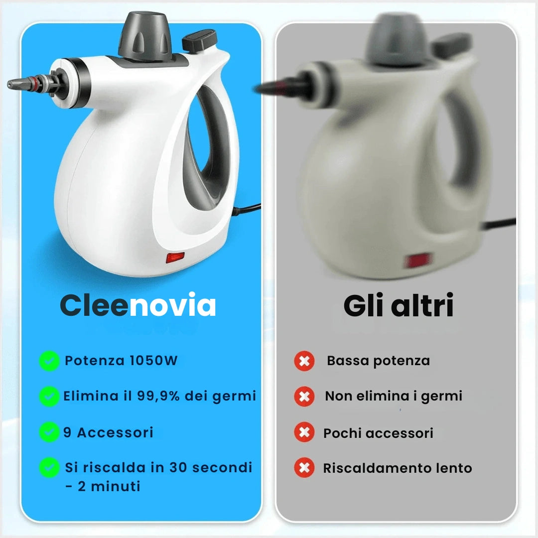 Cleenovia™ V12-Pro produce vapore secco a 104°C, eliminando efficacemente il 99,9% di germi e batteri.