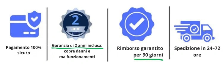 Se non sei completamente soddisfatto del tuo acquisto, ti basta restituirlo e riceverai un rimborso totale — senza alcuna domanda o condizione.