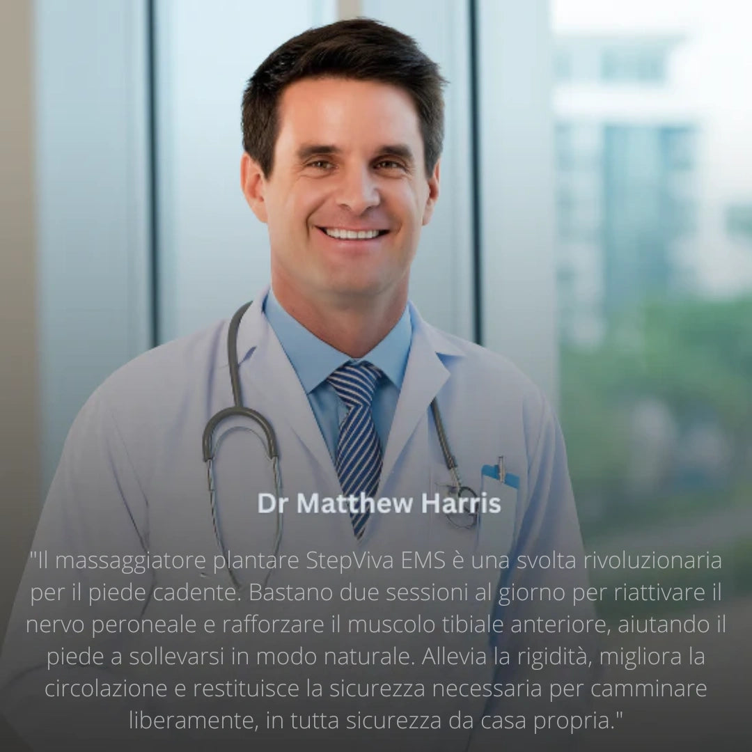 StepViva™ offre una soluzione più intelligente e duratura. Inviando impulsi EMS costanti, riattiva i nervi e i muscoli responsabili del sollevamento del piede, ripristinando forza e mobilità in modo naturale, senza pillole o procedure invasive.