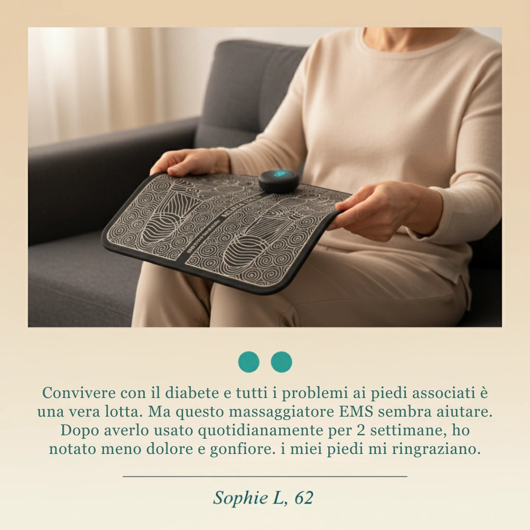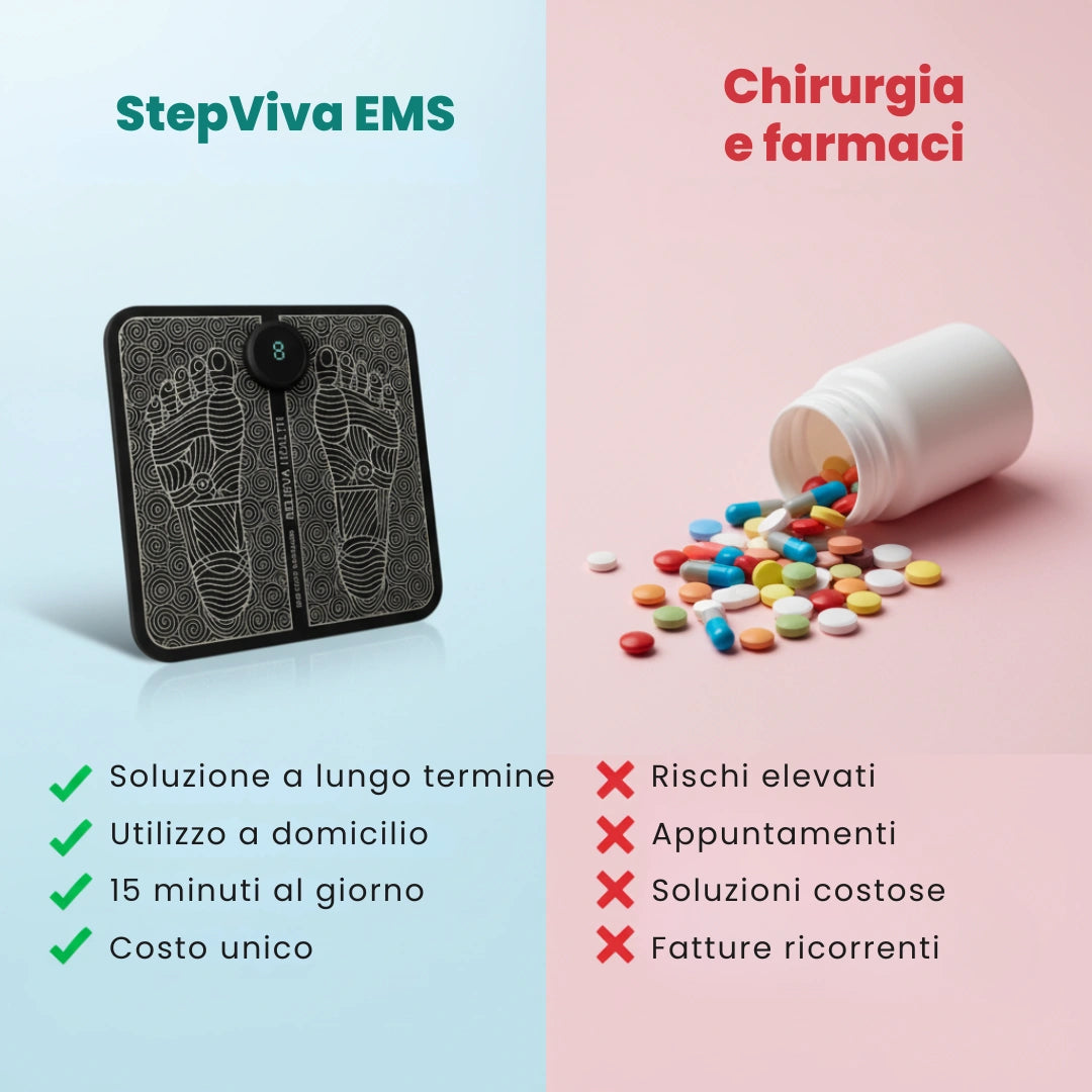StepViva™ è l'alternativa intelligente e definitiva. Sfrutta una tecnologia EMS sicura che invia delicati impulsi per "risvegliare" i nervi e i muscoli del piede addormentati. Ti aiuta a recuperare il controllo, ridurre la rigidità e muoverti di nuovo con fluidità. Tutto questo senza tutori restrittivi, senza pillole e senza controindicazioni.